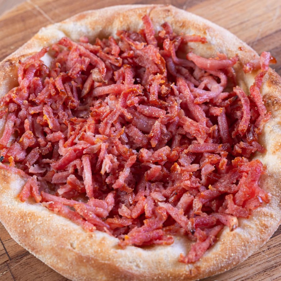 Pizza composta por: Churrasco, Calabresa fresca assada no forno, Muçarela, bacon e molho barbecue. Para os amantes de Churrasco, agora em forma de pizza!