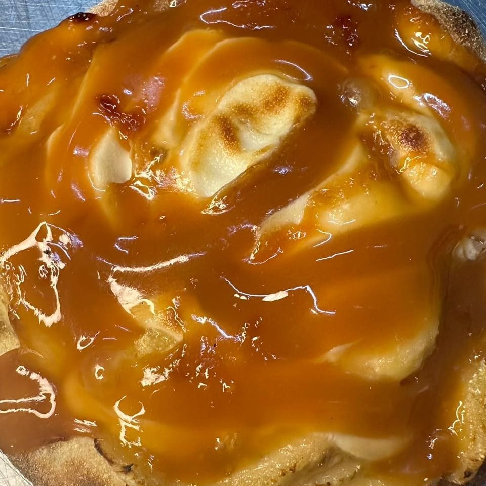 Deliciosa Pizza de Banana nanica, madura e selecionada, Coberta com Chocolate branco assado no forno!
