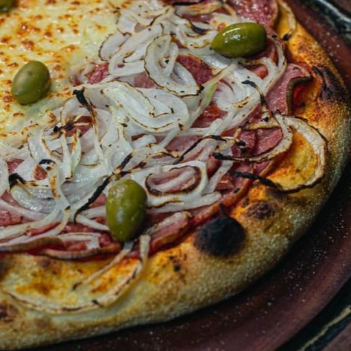 MASSA DE LONGA FERMENTAÇÃO , MOLHO DE TOMATE , MUSSARELA E CALABRESA ACEBOLADA