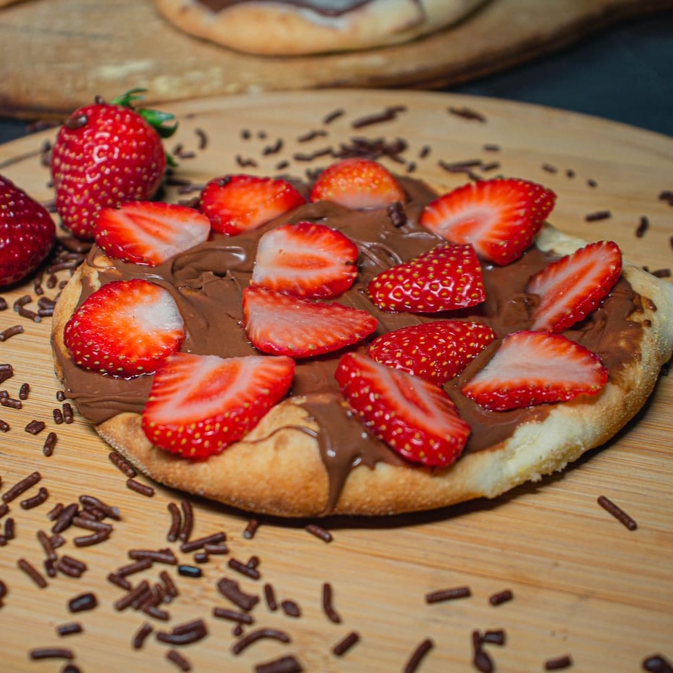 Deliciosa Esfiha para os amantes de Nutella, massa macia com muita Nutella verdadeira, coberta com morangos! A criançada adora!