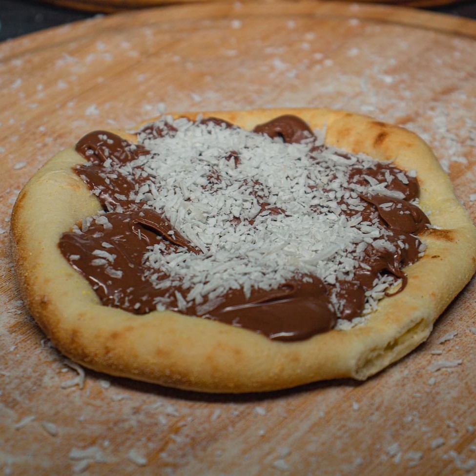 Deliciosa Pizza com a massa super macia coberta com chocolate ao leite e coco ralado!