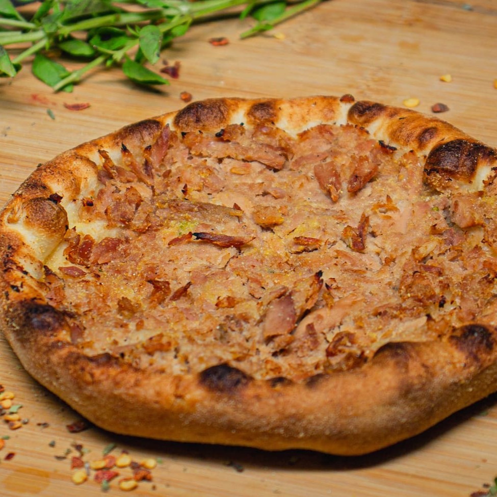 Deliciosa Esfiha composta por: Pernil refogado, Muçarela e molho barbecue.