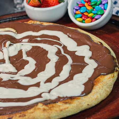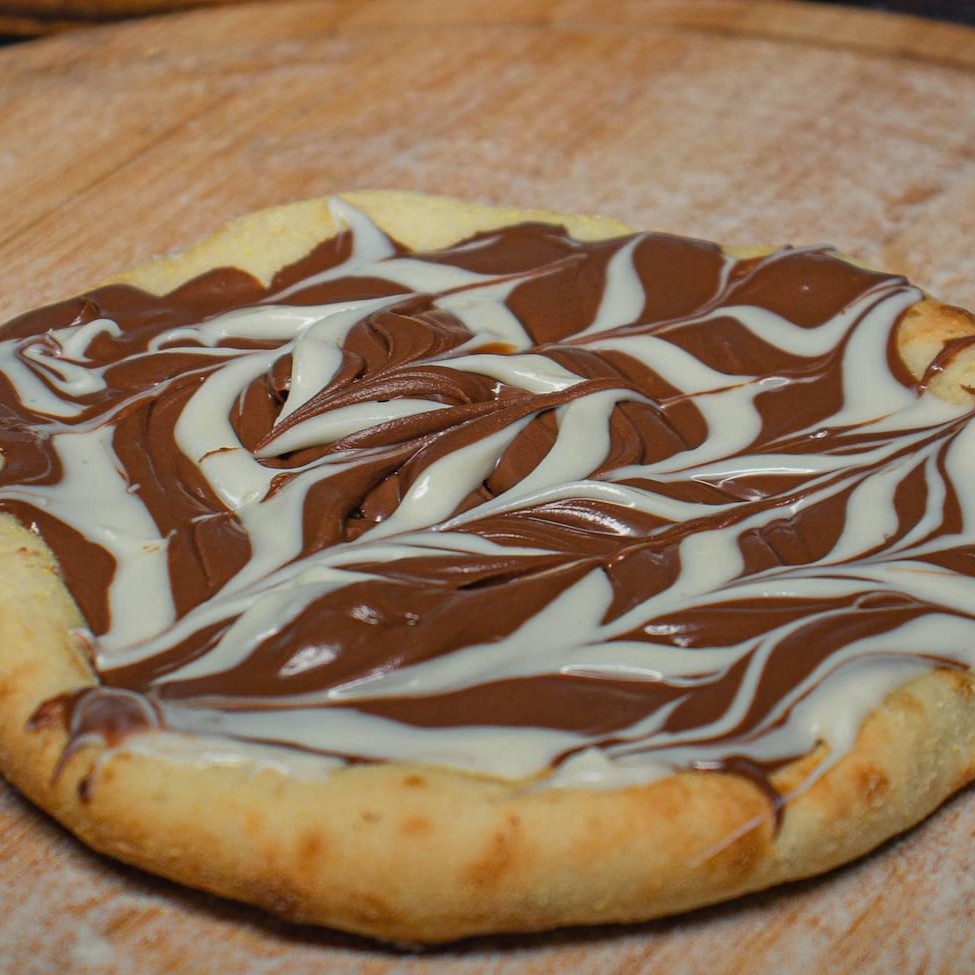 Deliciosa Pizza com sabor de infância, lembra muito aquele doce clássico, junção de chocolate ao leite com chocolate branco!
