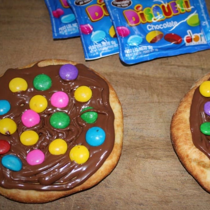Deliciosa Esfiha, coberta com Chocolate ao leite e confeitos estilo M&Ms!