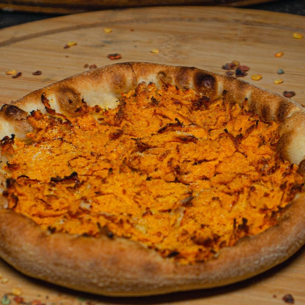 massa de longa fermentação, molho e calabresa e cebola