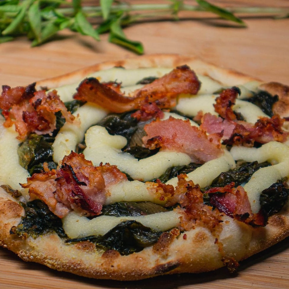Escarola temperada ao alho, bacon crocante, coberta com Muçarela ou Catupiry Original!