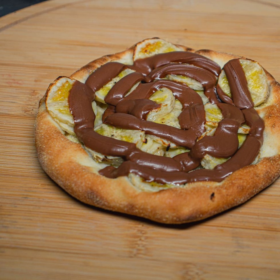 Deliciosa Pizza de Banana nanica, madura e selecionada, Coberta com Chocolate branco assado no forno