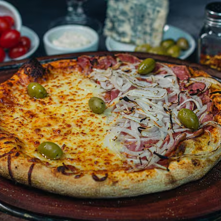 massa de longa fermentação, molho, muçarela e calabresa acebolada