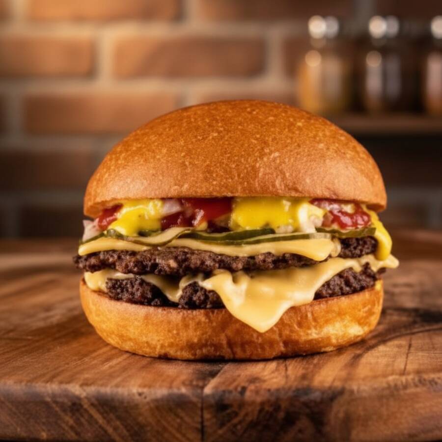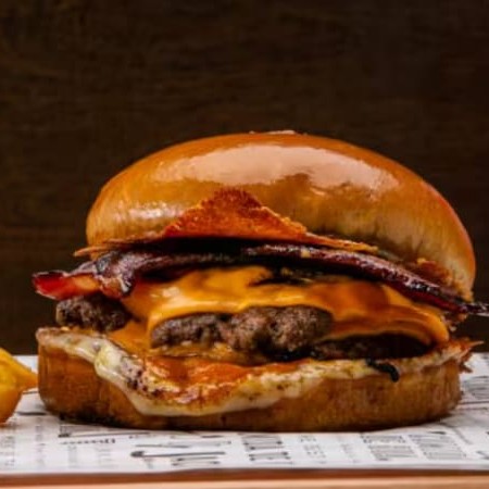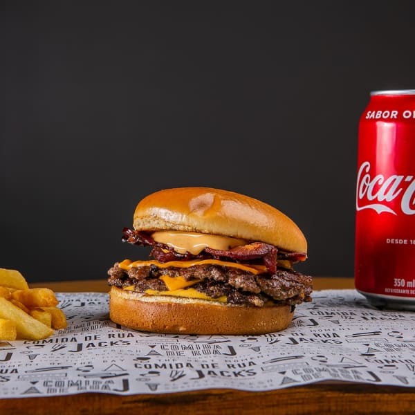 O carro chefe da casa! O queridão! 2 carne smash de 60g, pão de brioche selado na chapa, queijo mussarela tostado e bem crocante, queijo cheddar derretido, bacon, uma porção de batata com nosso tempero secreto + Coca-Cola que deixa o hamburguer perfeito.