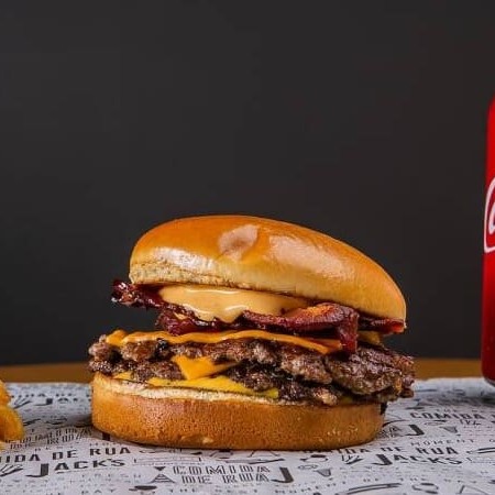 Bacon hoje, amanhã e sempre! 2 deliciosos carne smash de 60g, queijo cheddar, Bacon, pão de brioche selado na chapa, e o nosso famosíssimo molho de churrasco. Acompanha uma porção de batatas com o temperinho secreto da casa + Coca-Cola 220ml bem gelada combina muito com hamburguer