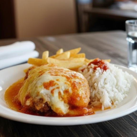 Acompanhado de arroz fresquinho, frango empanado coberto por queijo mussarela, banhado por molho de tomate artesanal bem quentinho. Obs; Não Acompanha Feijão.