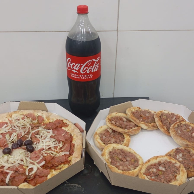 1 PIZZA MEIA/MEIA (CALABRESA E MUSSARELA) 15 ESFIHAS DE CARNE E 1 COCA COLA 2 LITROS