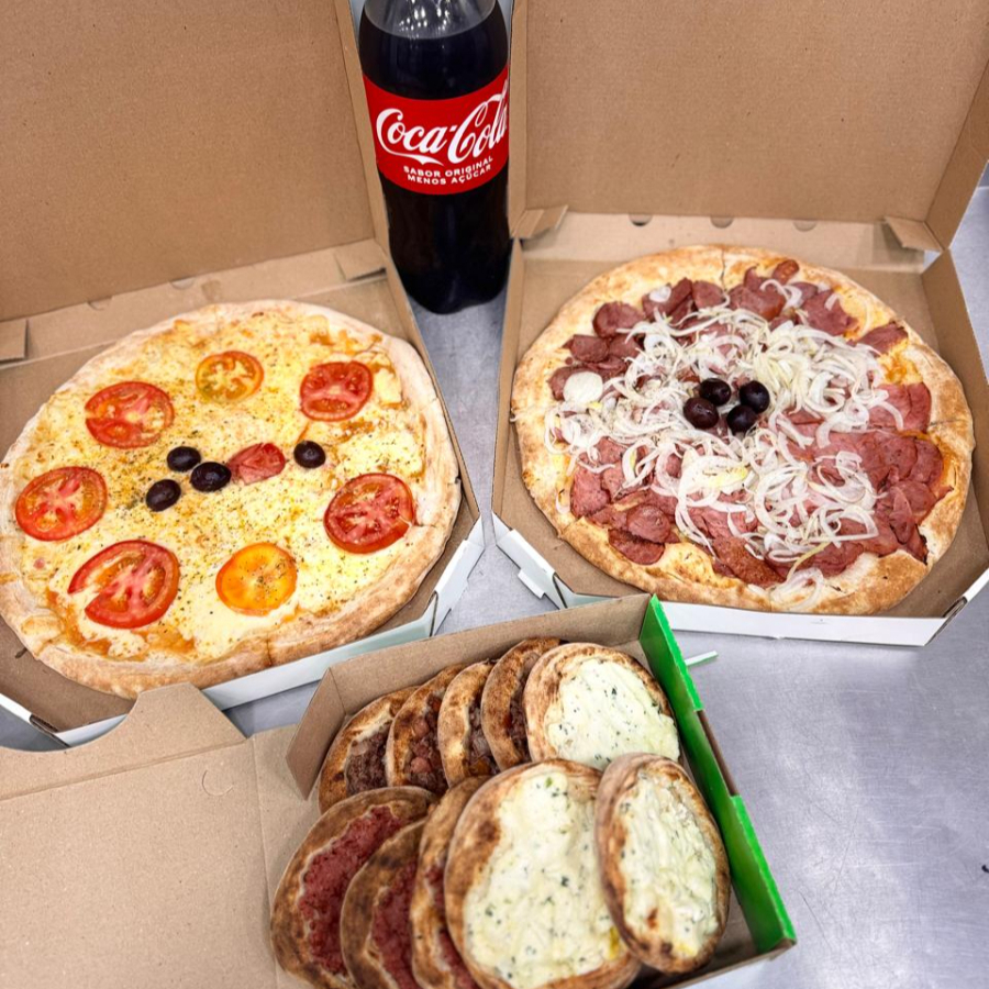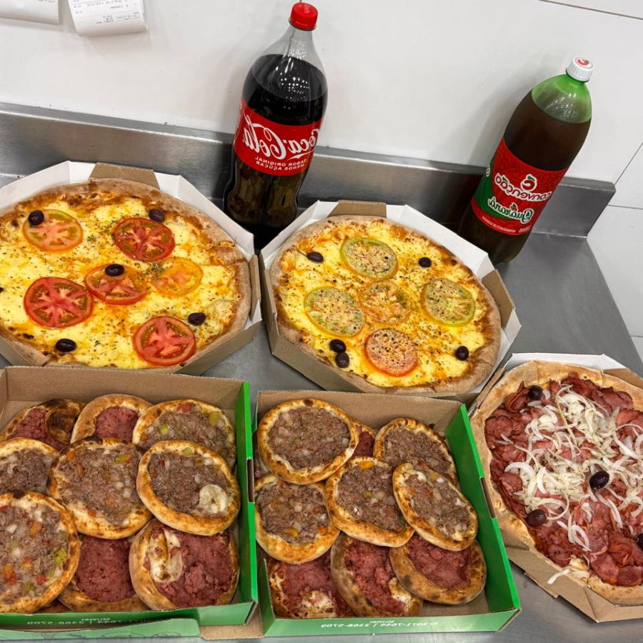 3 PIZZAS (MUSSARELA)(CALABRESA)(NAPOLITANA) 10 ESFIHAS DE CARNE 10 ESFIHAS DE CALABRESA ( 1 COCA COLA 2 LITROS 1 CONVENCAO 2 LITROS )