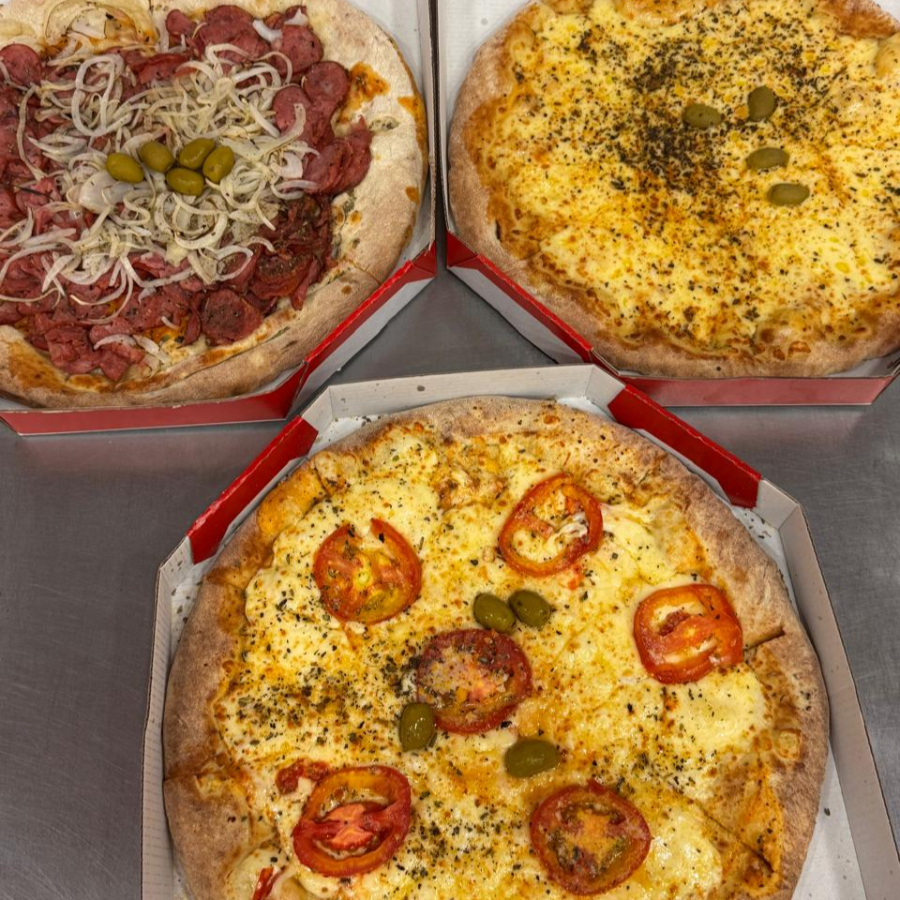 1 pizza mussarela, 1 pizza calabresa, 1 pizza napolitana