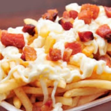 Delicie-se com a nossa 'Porção Batata Especial' com a inclusão de cheddar, bacon e parmesão. Imagem meramente ilustrativa