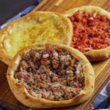 Pão sírio com dois hambúrgueres de picanha, cada um pesando 120 gramas. Acompanham esses hambúrgueres, fatias de presunto, queijo, ovo frito, catupiry, alface e tomate. Imagem meramente ilustrativa
