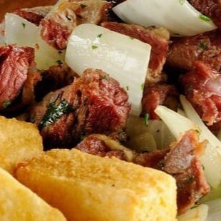 A deliciosa 'Porção Carne Seca com Mandioca' Acompanhada de mandioca frita, Para completar, uma generosa cebola frita, crocante e dourada. imagem meramente ilustrativa