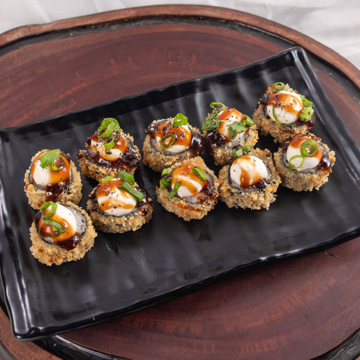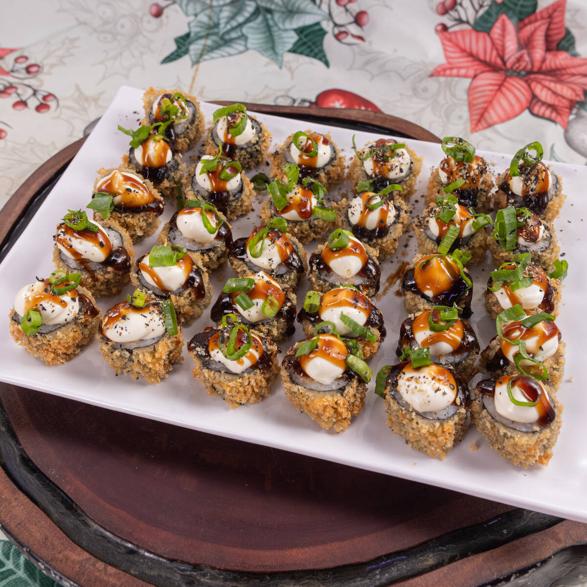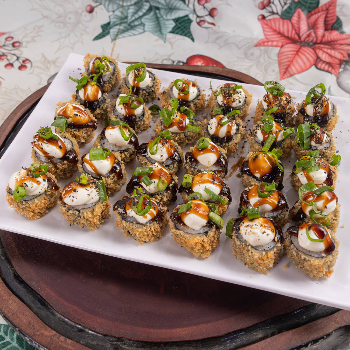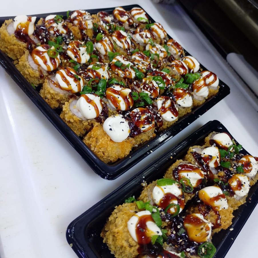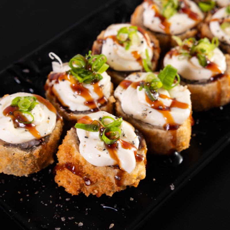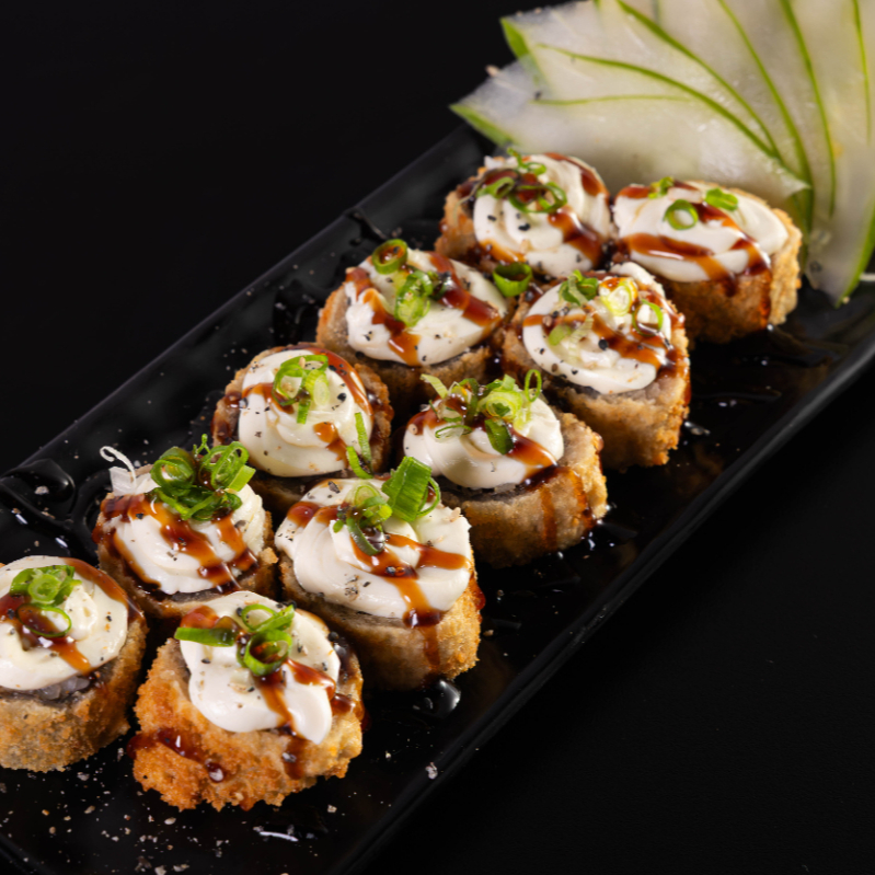 ARROZ JAPONES(SHARI)GENEROSA PORÇÃO DE SÃO CRU, BORRDA DE CREAM CHESSE E CEBOLINHA FRESCA