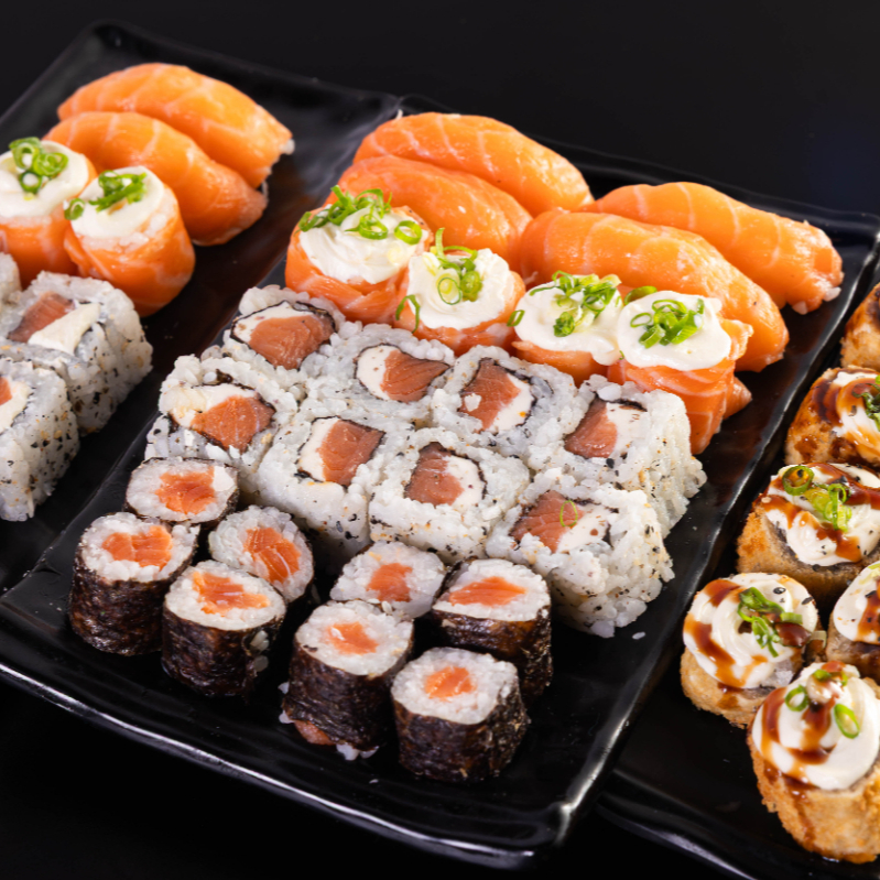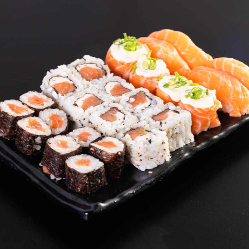 Leve 2 combo de salmão de 12 unidades cada por 74,99 4 NIGUIRI, 4 JOE, 8 URAMAKI PLILELFIA, 8 HOSSOMAKI