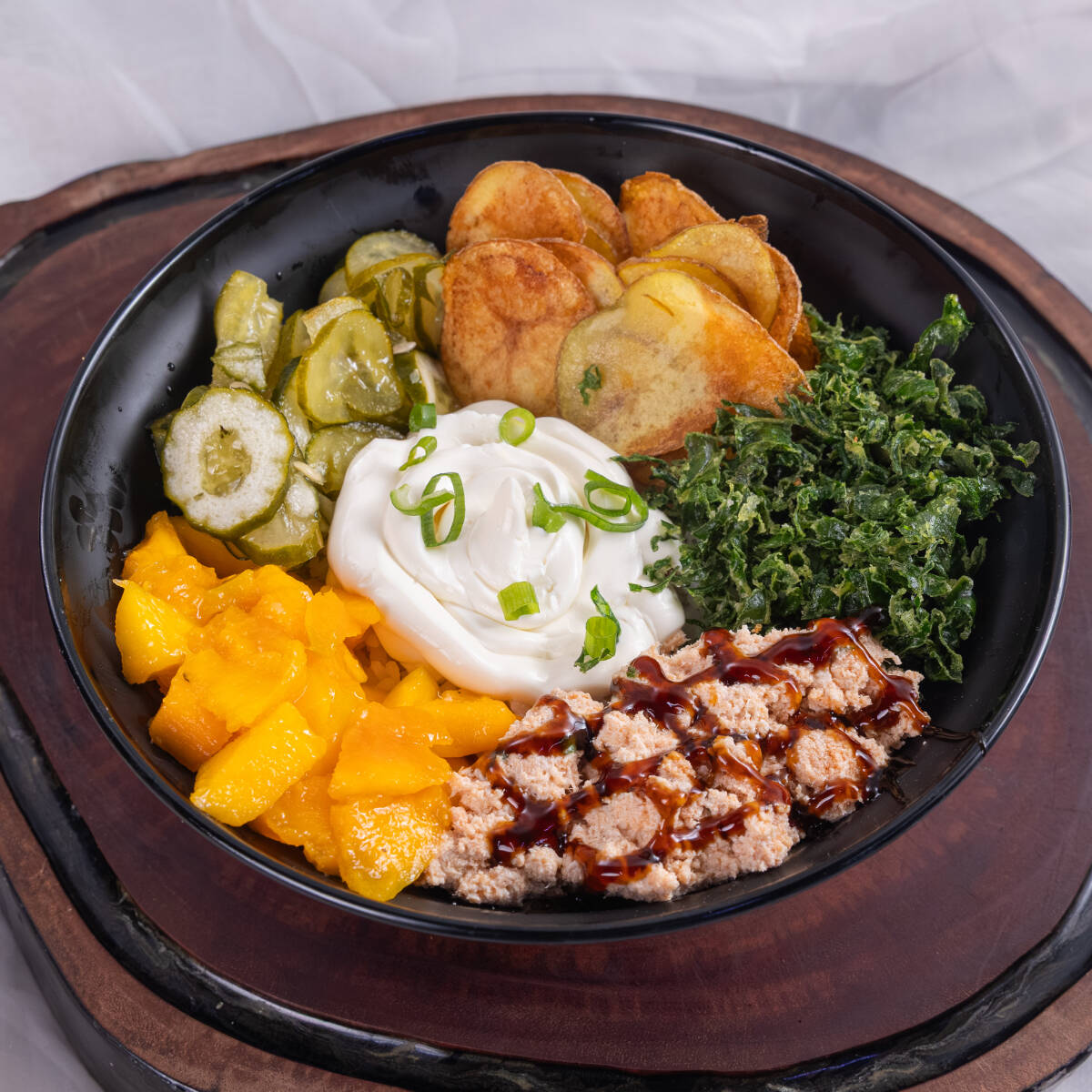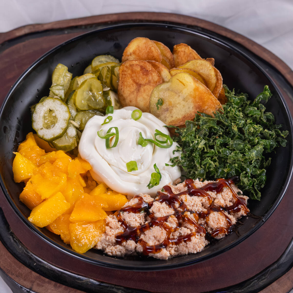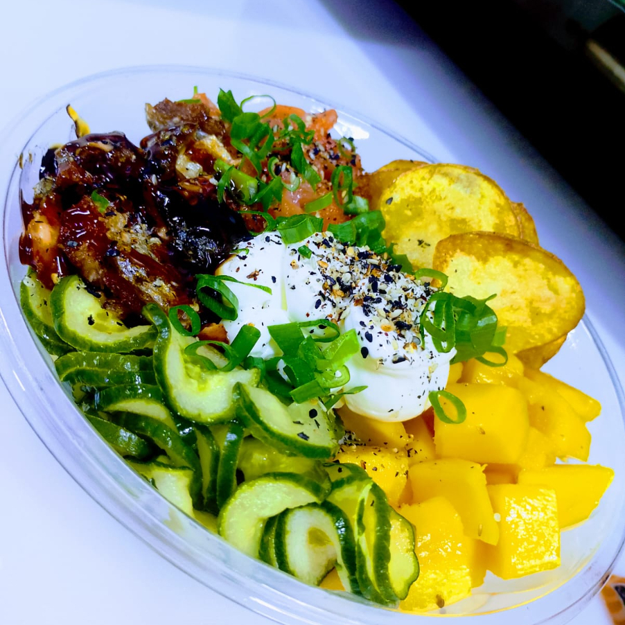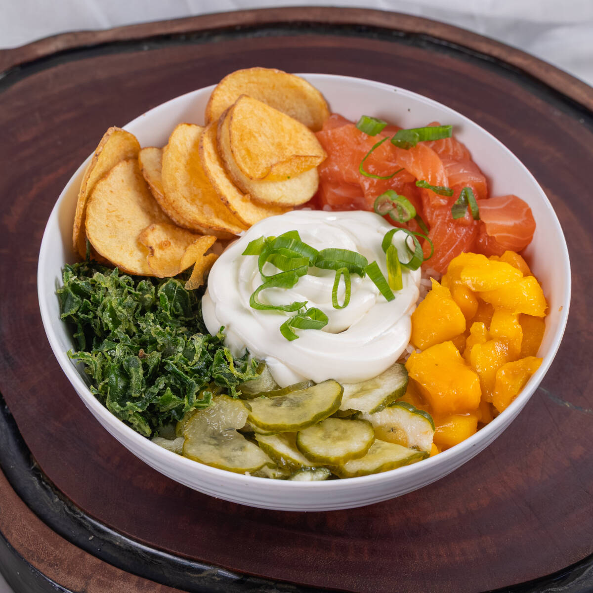 Arroz ( japones ) de salmão grelhado com cream cheese cebolinha sunomono couve crisp e batata cHIPIC E MANGA