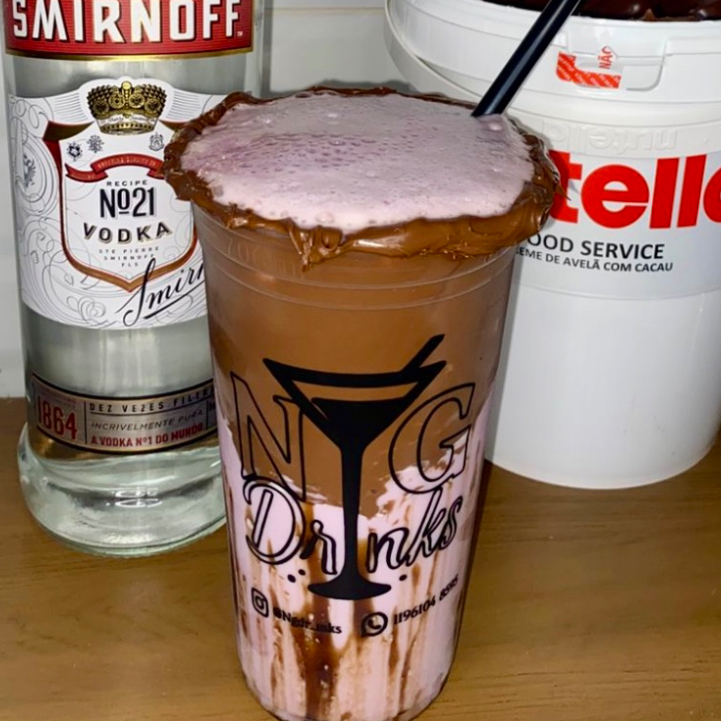 Feito com Vodka Sminorf,saque ou Jurupinga (por favor mardar na observação qual das 3 opções voce vai querer),leite condensado,morango,fini nutela na borda do copo e cobertura de morango da marca fino