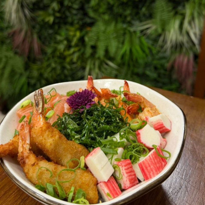 Arroz Japones (Gohan), Salmão Cru, Kani, Camarão Empanado, Camarão na Chapa, Couve Frita