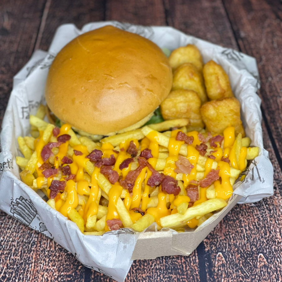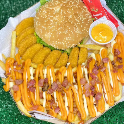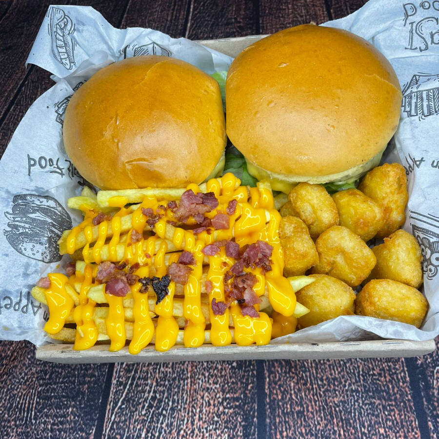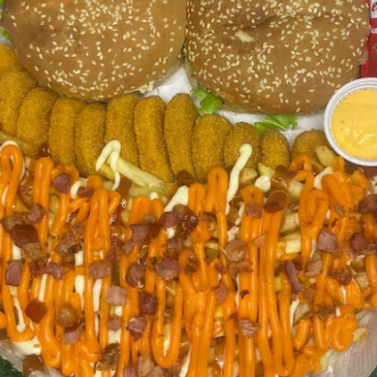 2 lanches + nuggets OU onions + batata recheada com ketchup, maionese, cheddar e bacon.