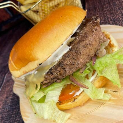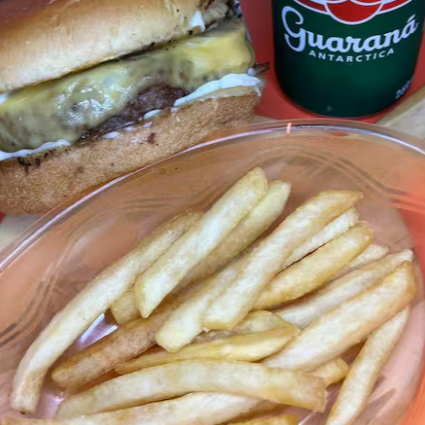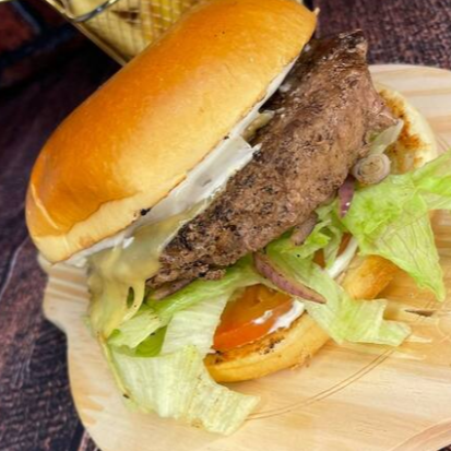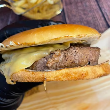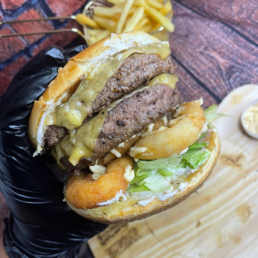 Pão brioche, maionese defumada, alface americana, onions, 2 hamburgueres artesanais (180g cada), queijo prato.