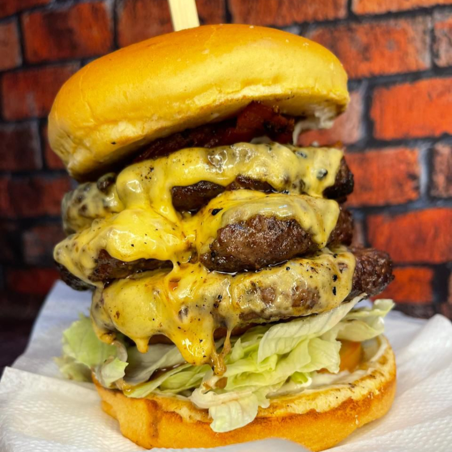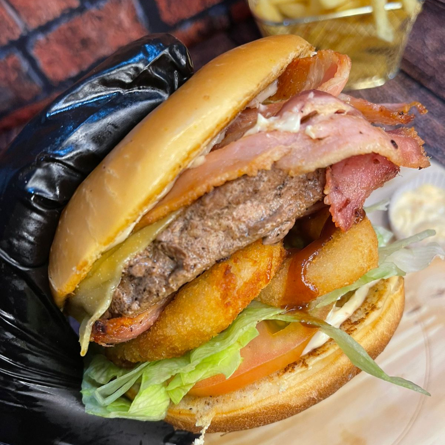 Pão brioche, maionese defumada, tomate, alface, picles, onions, cebola caramelizada, bacon em tiras, 3 hamburgueres artesanais (180g cada), queijo prato.