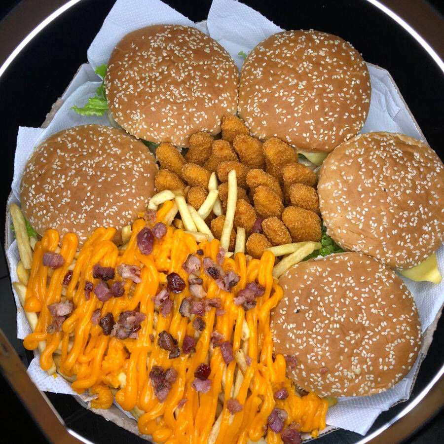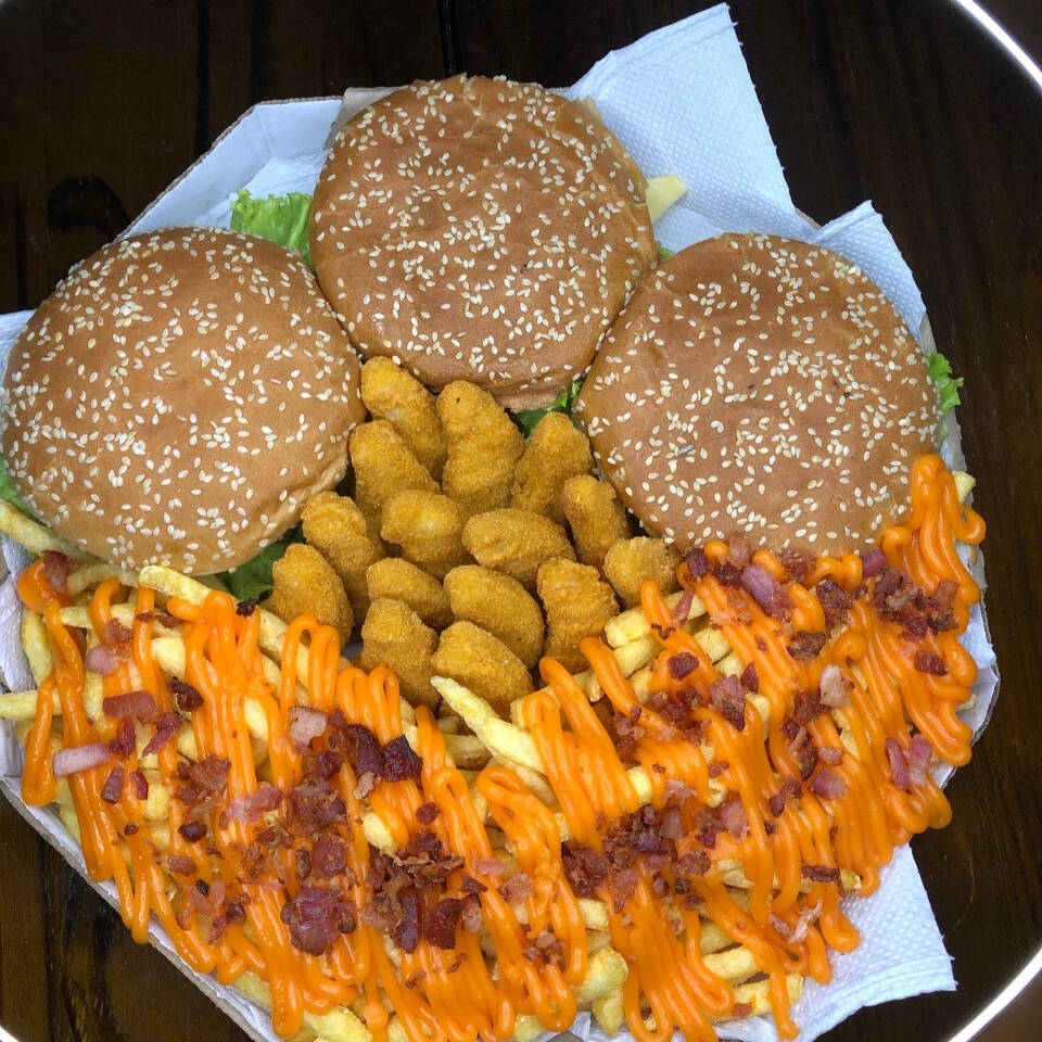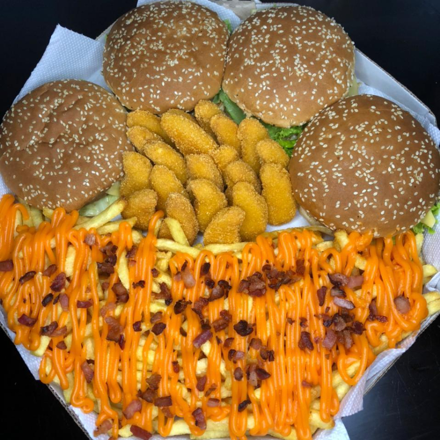 6 lanches + nuggets + batata com cheddar e bacon + onions rings
