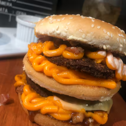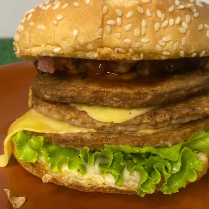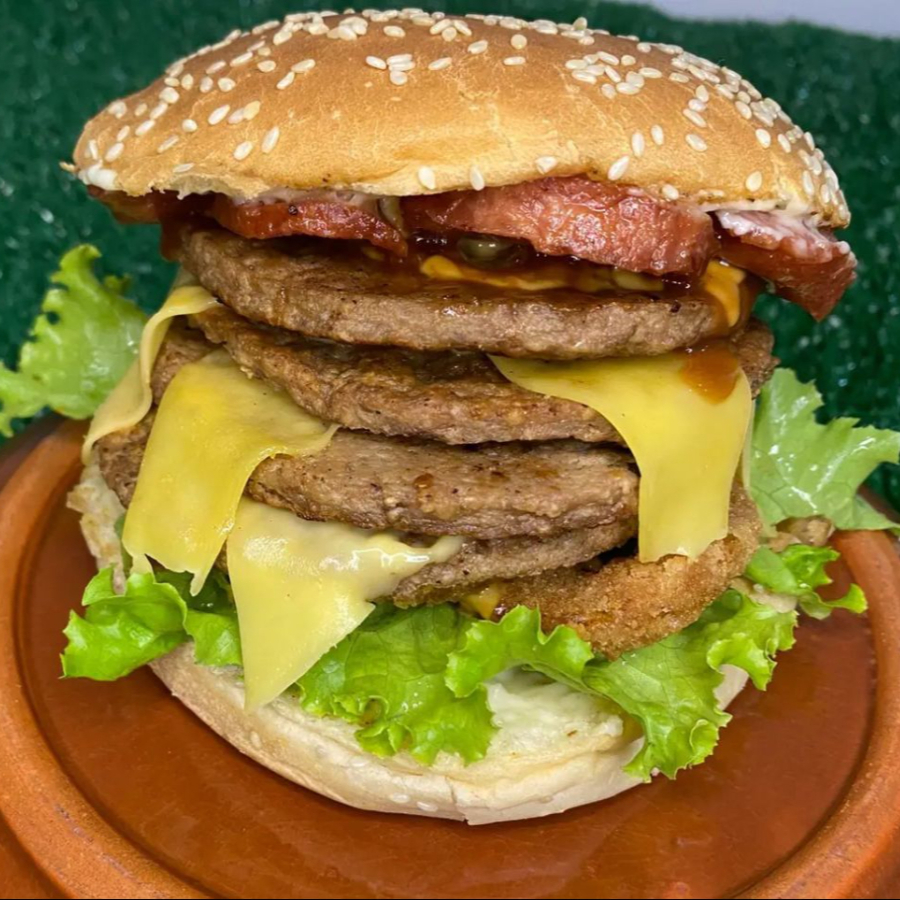 Bacon Nico Maionese, 3 hamburgueres, alface, tomate, bacon, barbecue, molho especial e queijo.