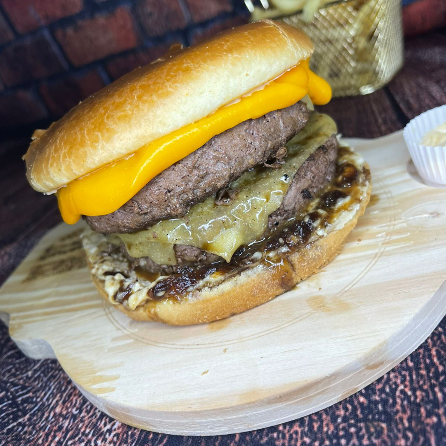 Pão brioche, cebola caramelizada, cheddar, 2 hamburgueres artesanais (180g cada), queijo cheddar.
