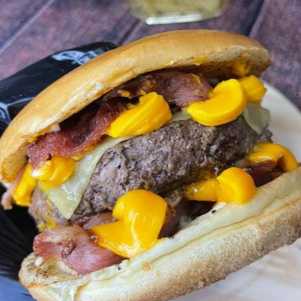 Pão brioche, baconese, bacon picado, bacon em tiras, cheddar e hamburguer artesanal (180g), queijo cheddar.