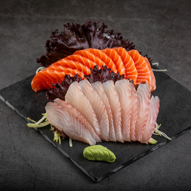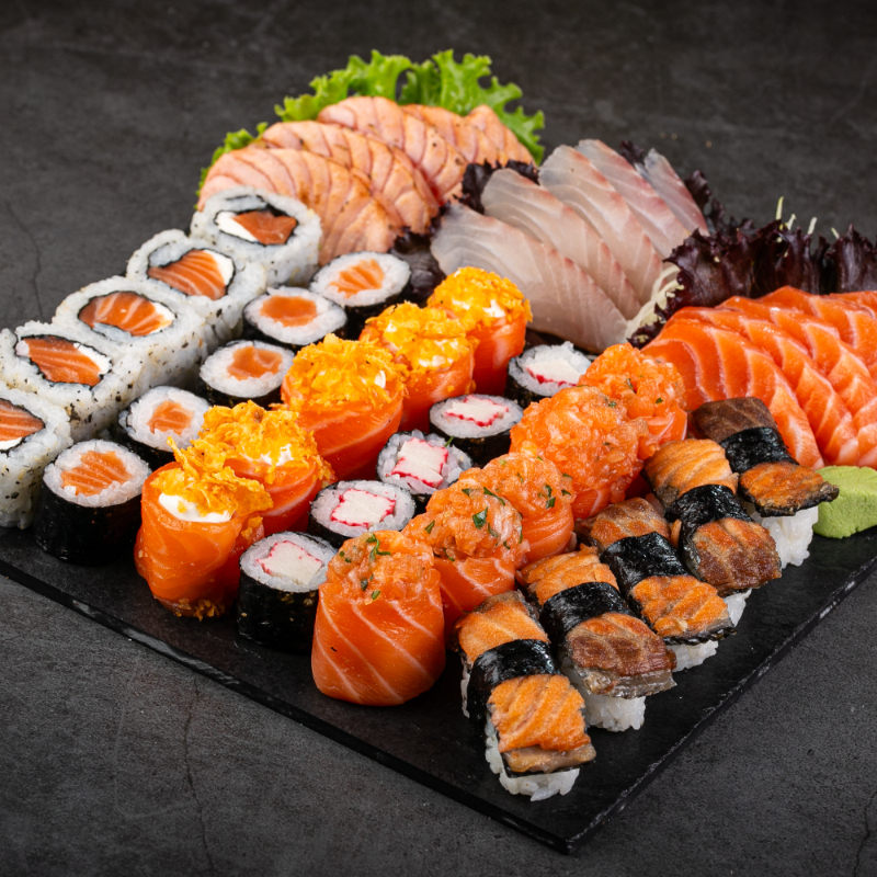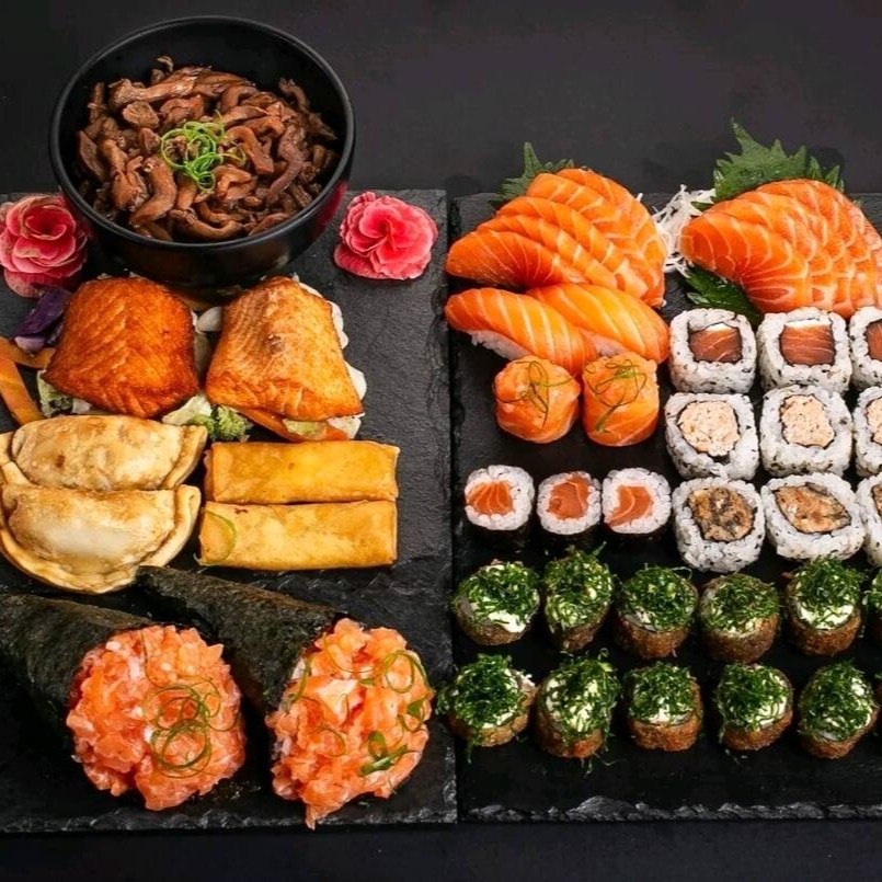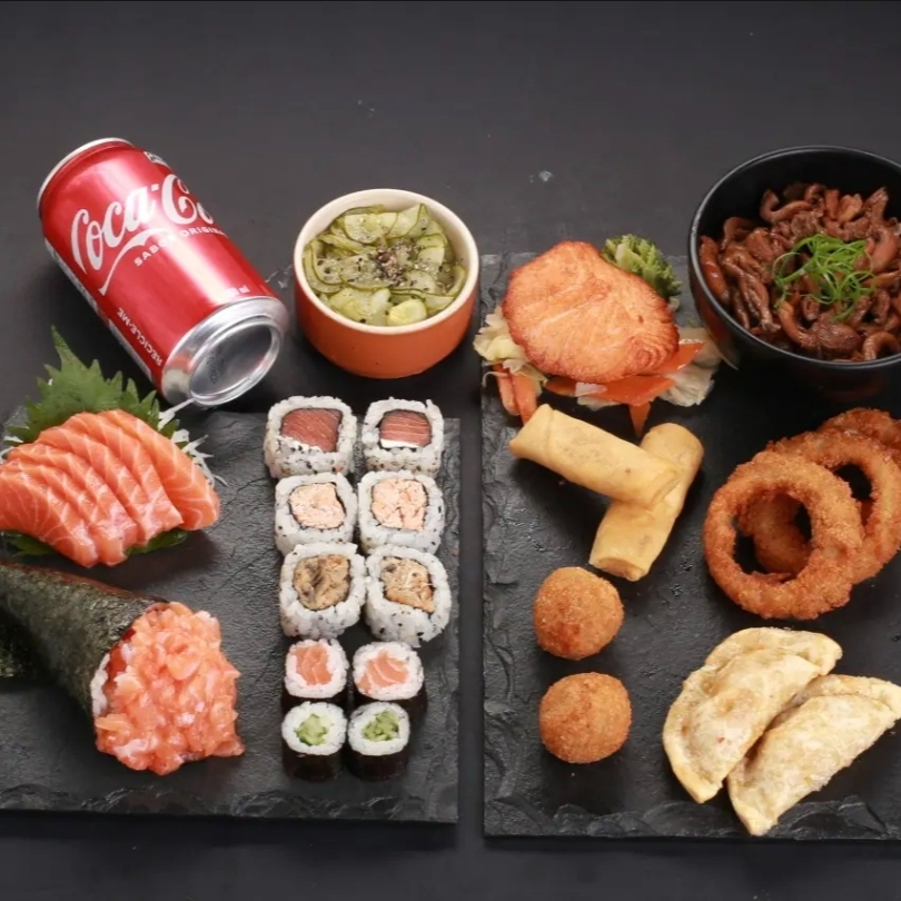 5 sashimi de tilápia,5sashimi de salmão,5 sashimi de salmão massaricado,5 uramaki salmão,5 dyo salmão,5 dyo Doritos,5 kanimaki,5 shakemaki e 5 niguiri skin