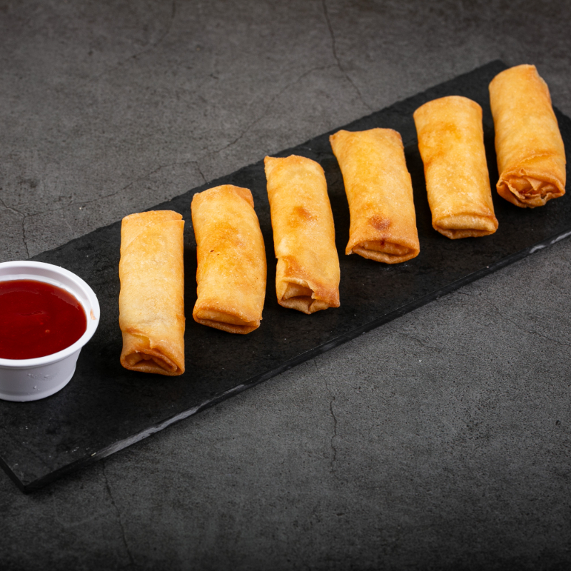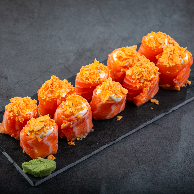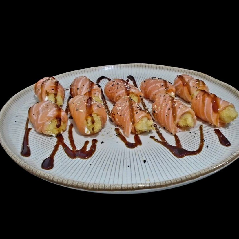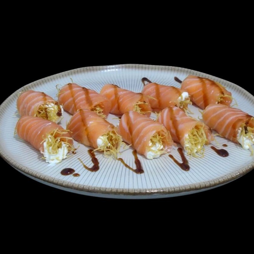 Enrolado empanado recheio de salmão,cream cheese,cebolinha,camarão tarê e gergelim