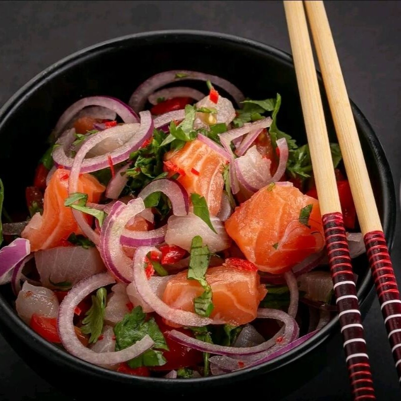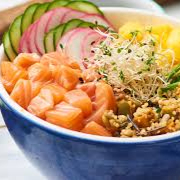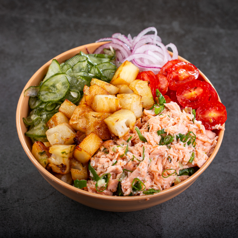 (Salmão grelhado, abacaxi grelhado, cebola roxa, pepino, tomate cereja, ao molho tare)