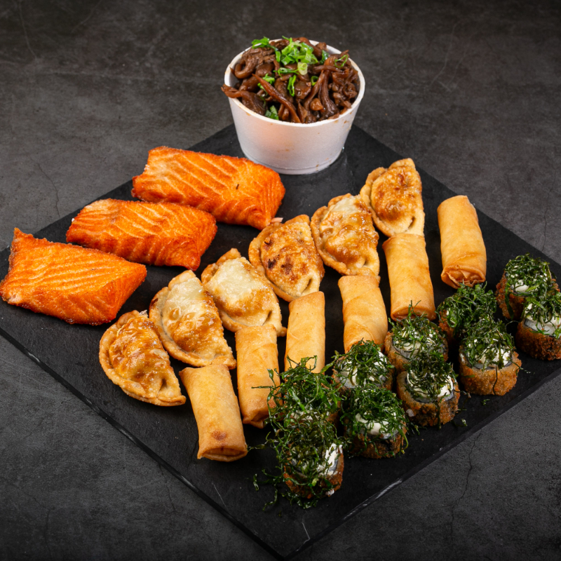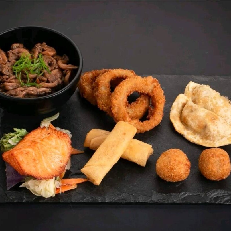 (1 shimeji , 1 salmão grelhado, 2 rolinho primavera de queijo, 2 croquete, 2 guioza, 2 cebola empanada sem alteração)