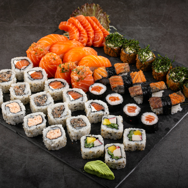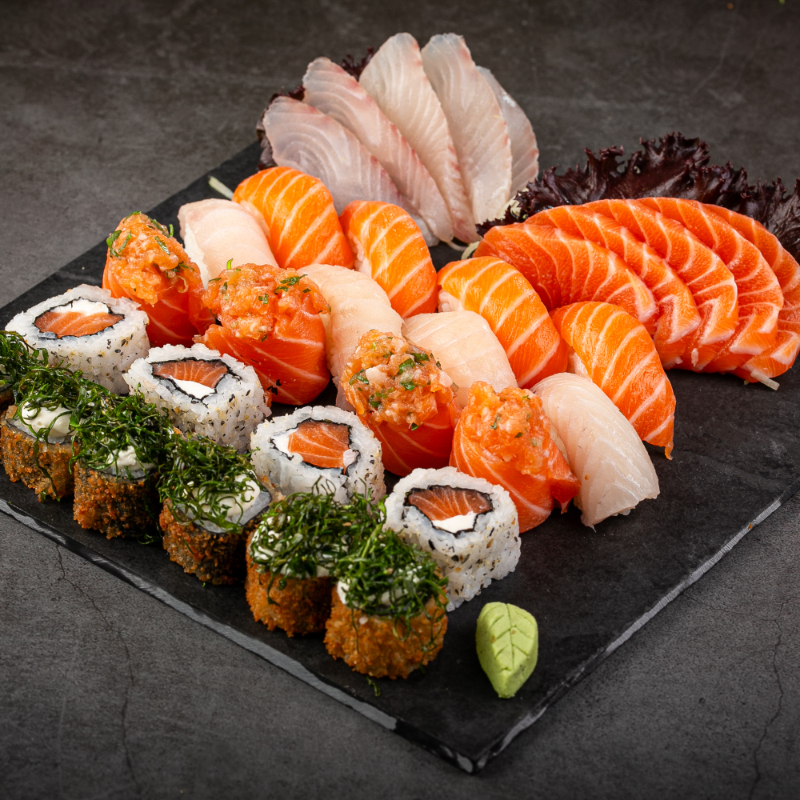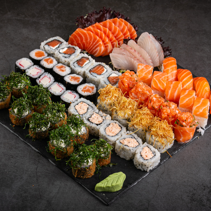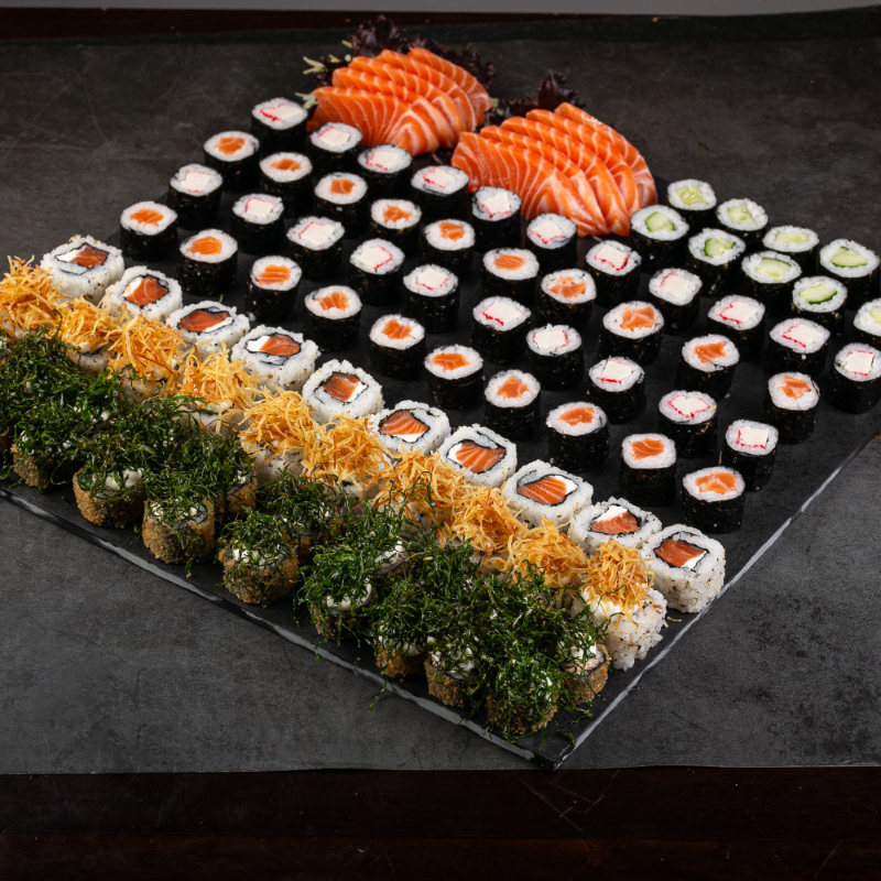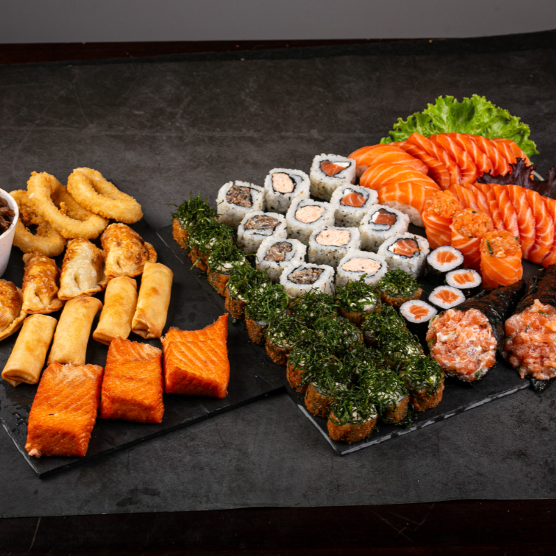 (6 sashimi salmão, 6 sashimi tilápia, 4 neguiri de salmão, 5 dyo de salmão, 5 uramaki salmão, 5 uramaki grelhado, 5 baterá de salmão, 5 shakemaki de salmão, 5 kanimaki, 4 uramaki skin crispe batata, 10 hot holls)