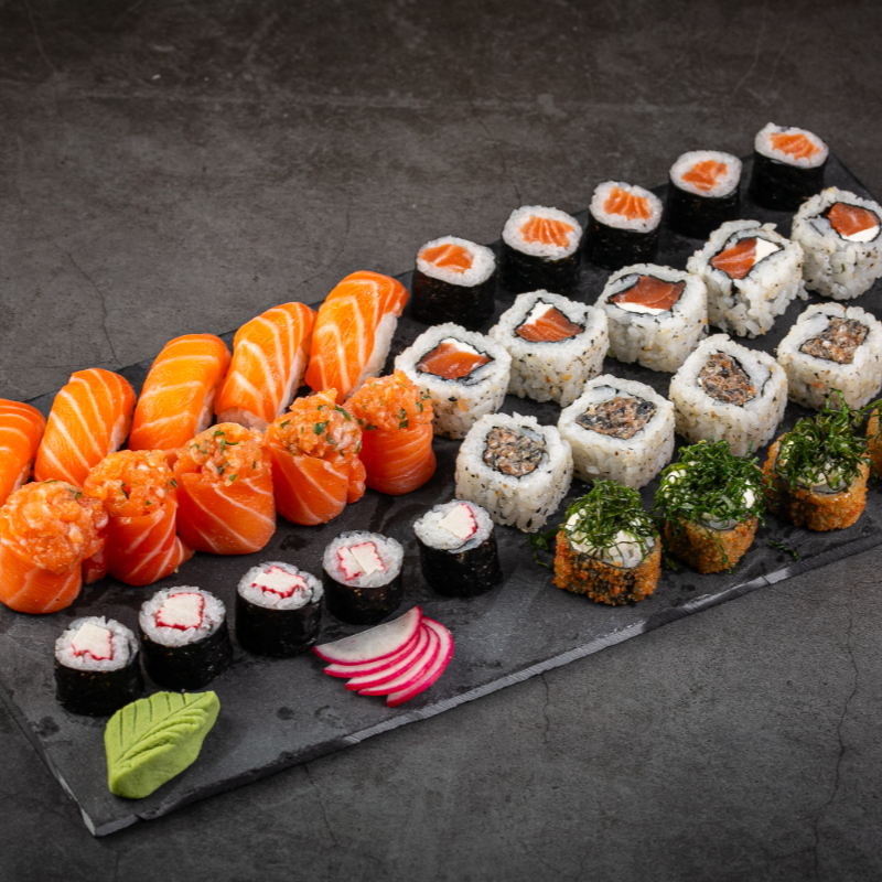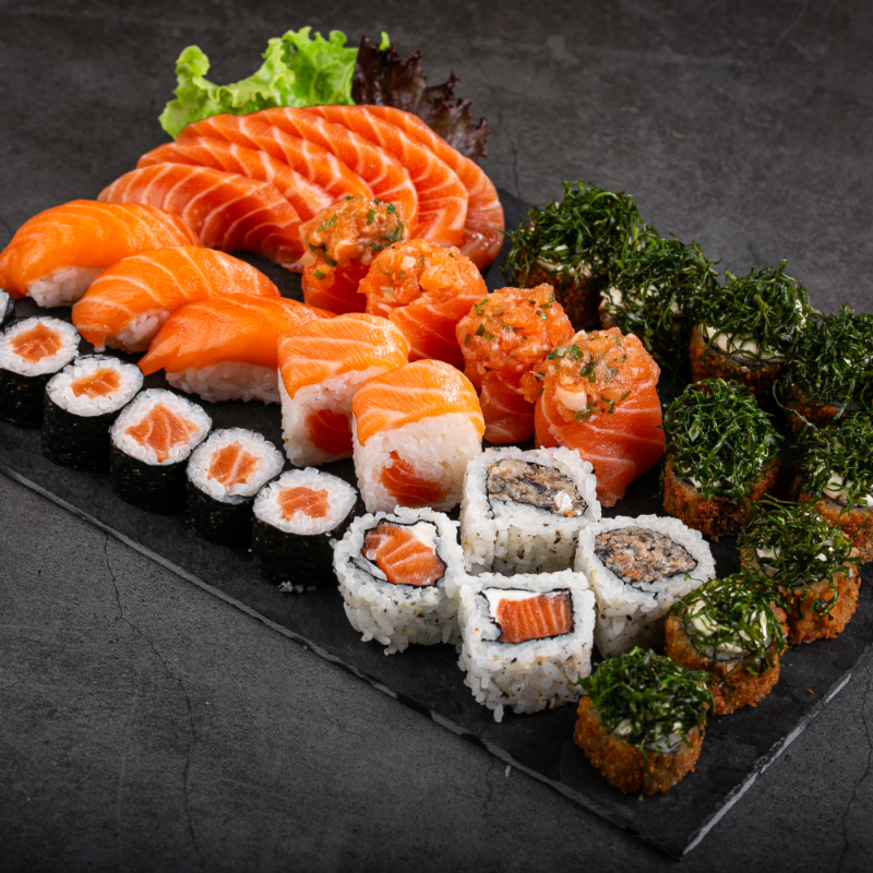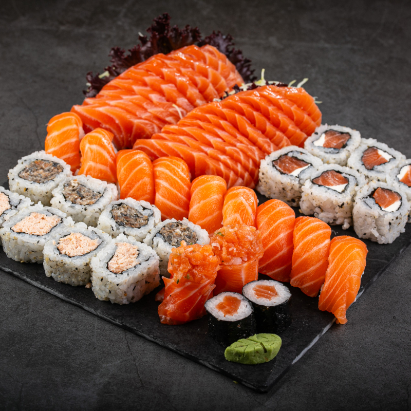 10 sashimis de salmão 3 shakemaki 2 niguiri salmão 2 dyo salmão3 uramaki skin 3 uramaki salmão grelhado 3 uramaki salmão 6 hot couve 6 hot cream cheese e 2 temakis salmão completos
