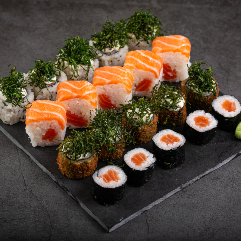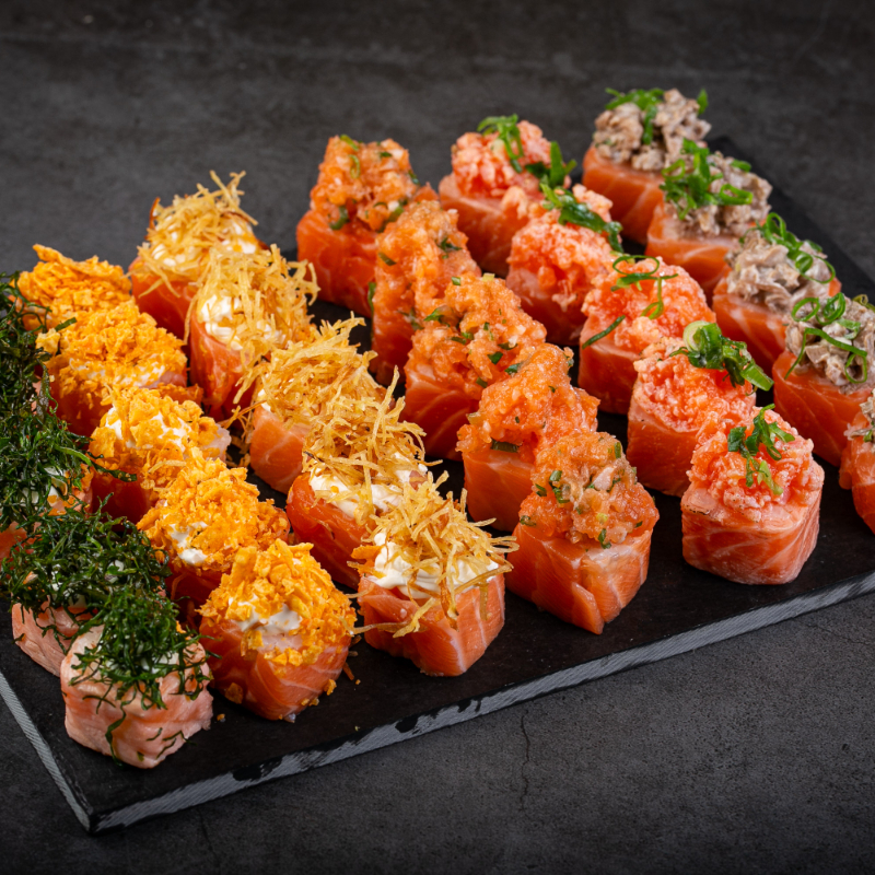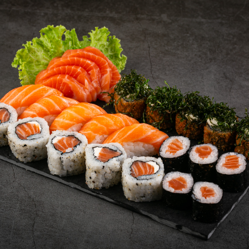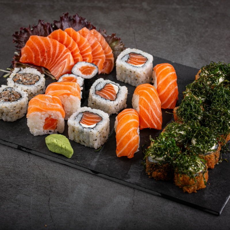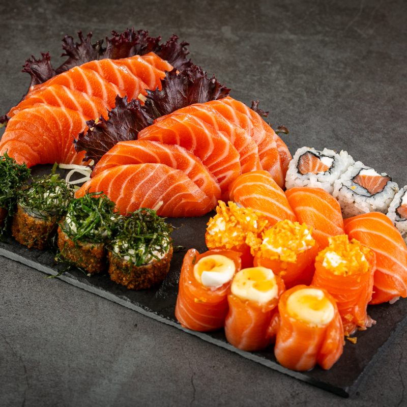 (5 sashimis de salmão, 5 niguiris de salmão, 5 hossomakis de salmão, 5 uramaki, 5 hot holl)