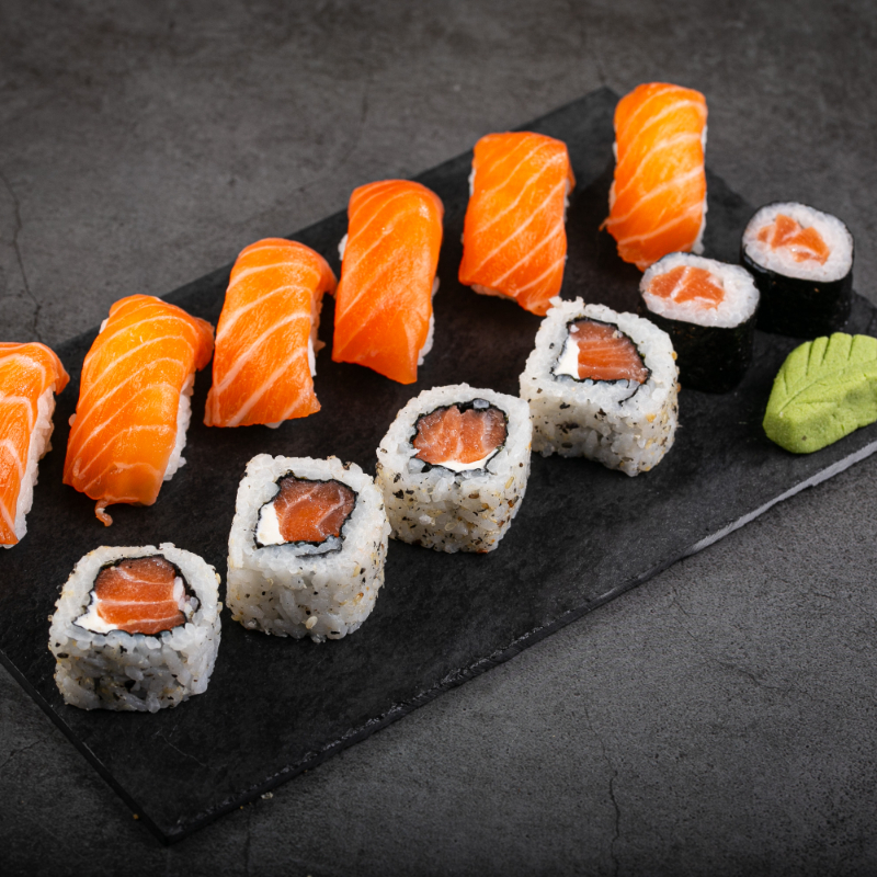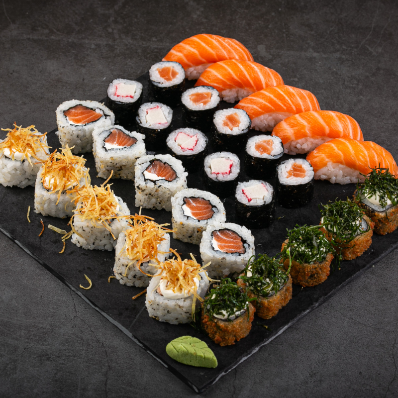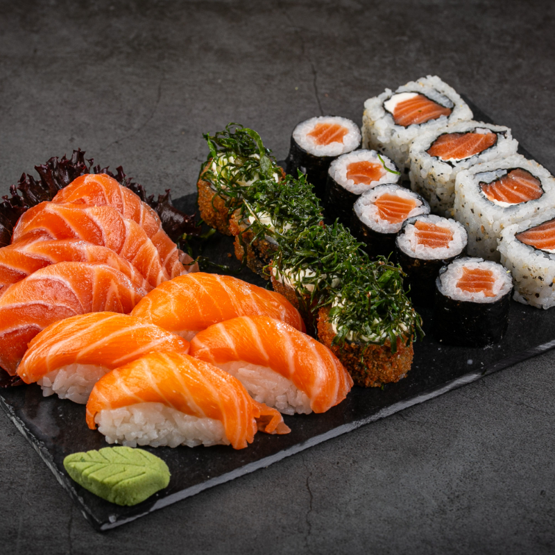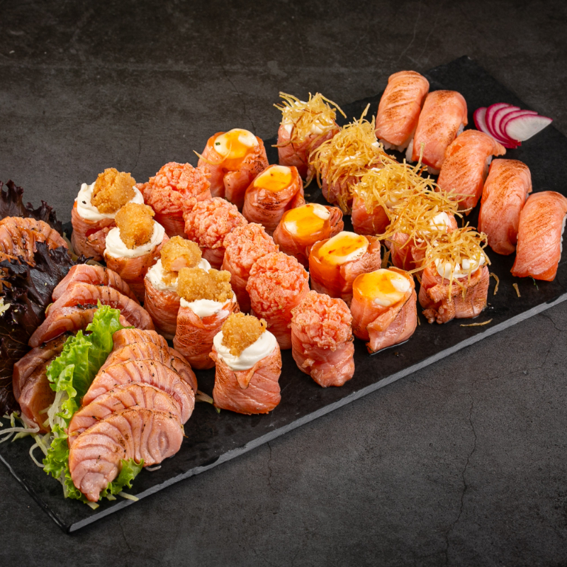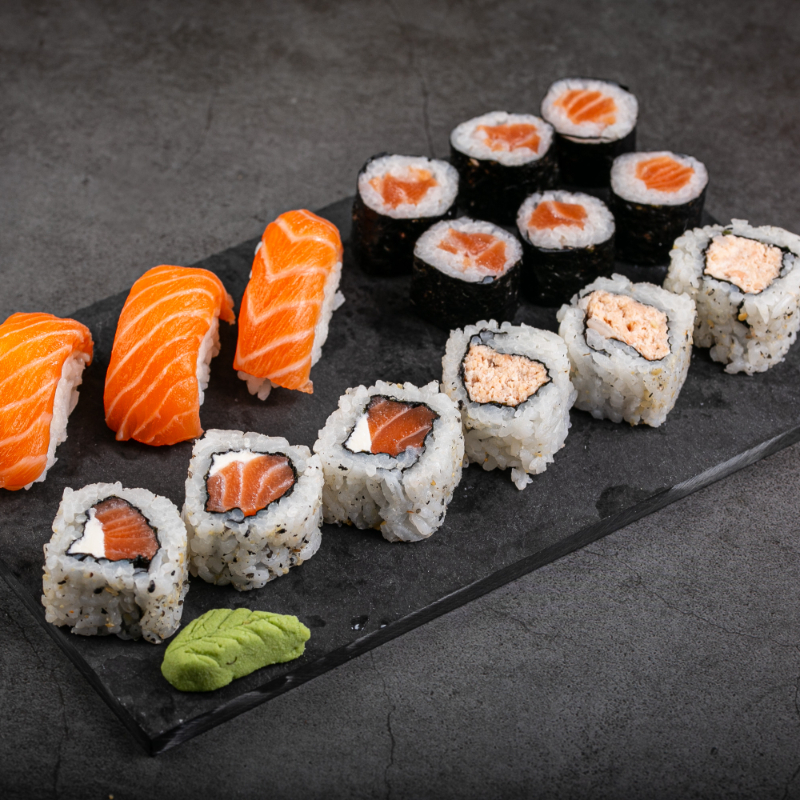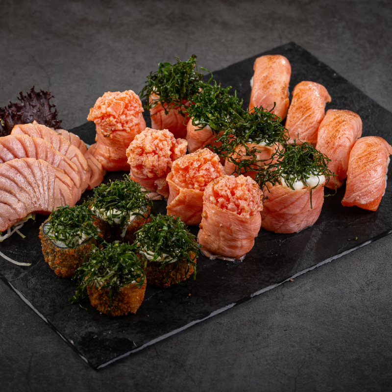 (5 sashimis de salmão, 5 niguiris de salmão, 5 hossomakis de salmão, 5 uramaki, 5 hot holl)