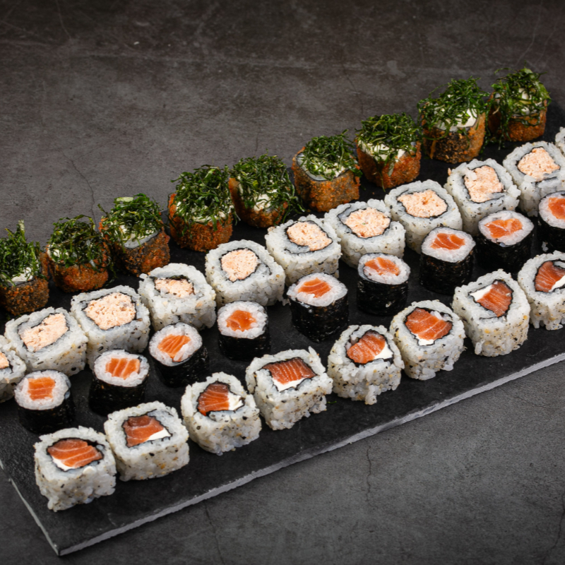 (10 uramakis de salmão, 10 hossomakis de salmão, 10 uramakis de salmão grelhado, 10 hot holls sem alteração)