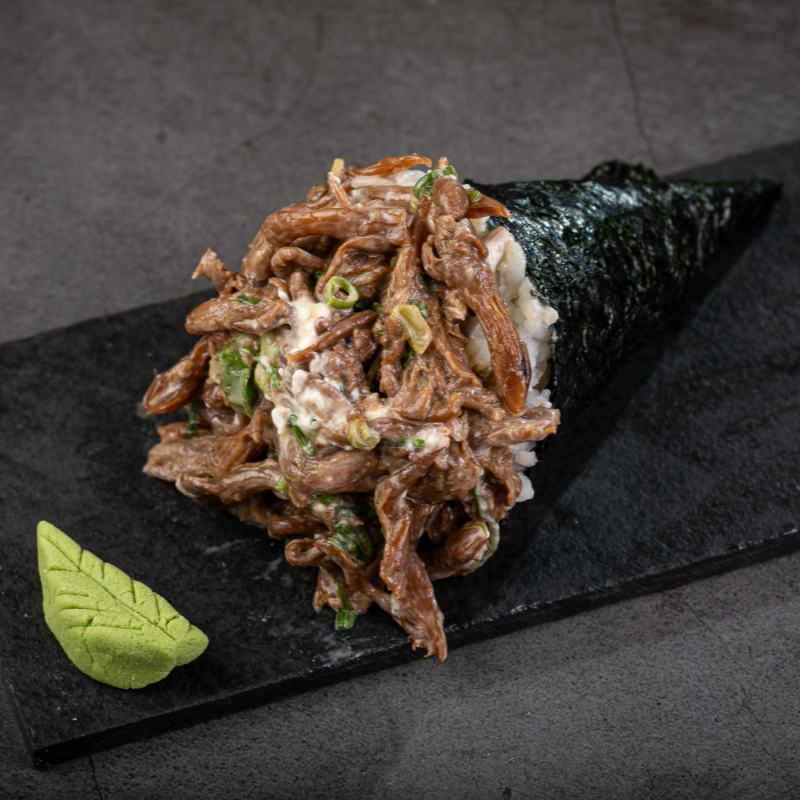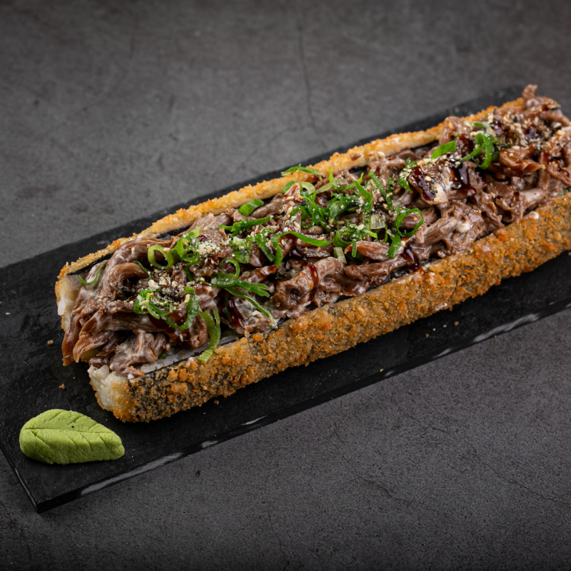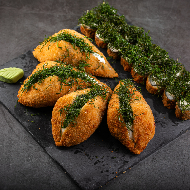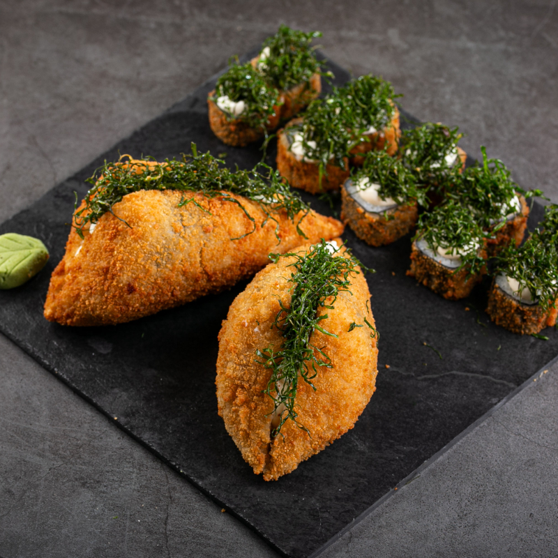 Enrolado empanado com recheio de shimeji,cream cheese,cebolinha,tarê e gergelim