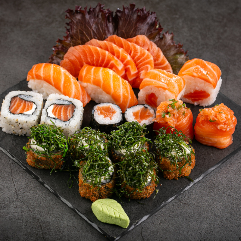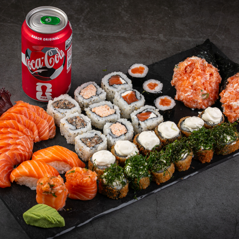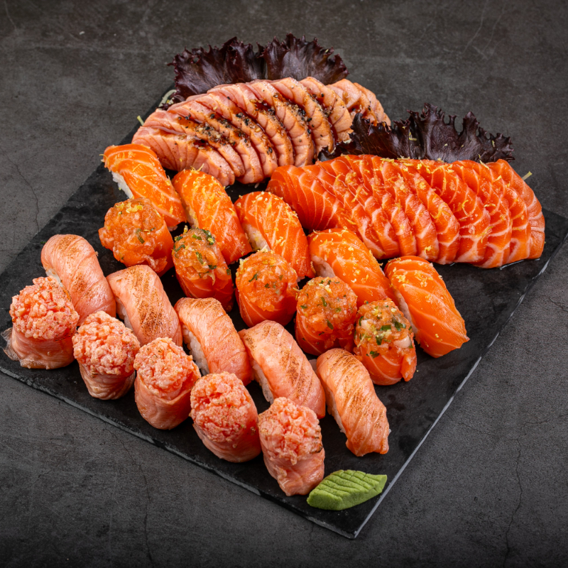 (35 peças: 6 sashimis de salmão, 3 neguiris de salmão, 2 baterá de salmão, 4 dyo de salmão, 6 hossomaki de salmão, 2 uramaki de salmão, 2 uramaki de salmão skin, 10 hot holls sem alteração)