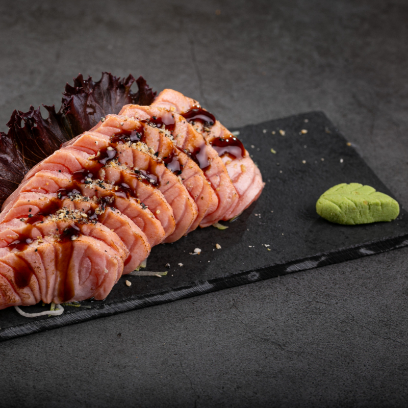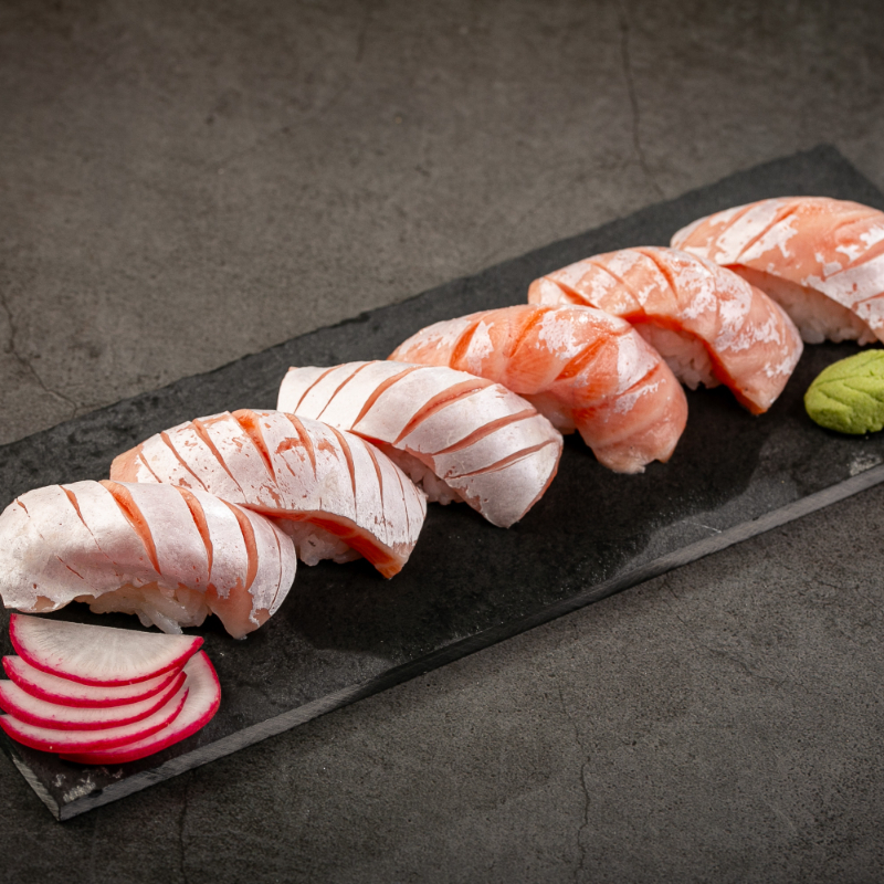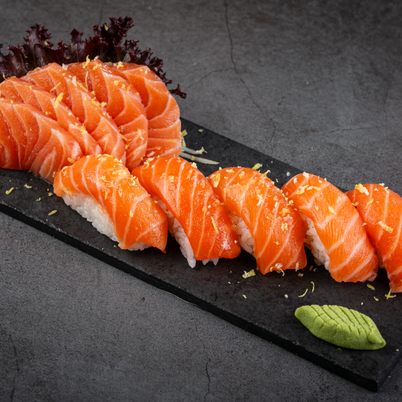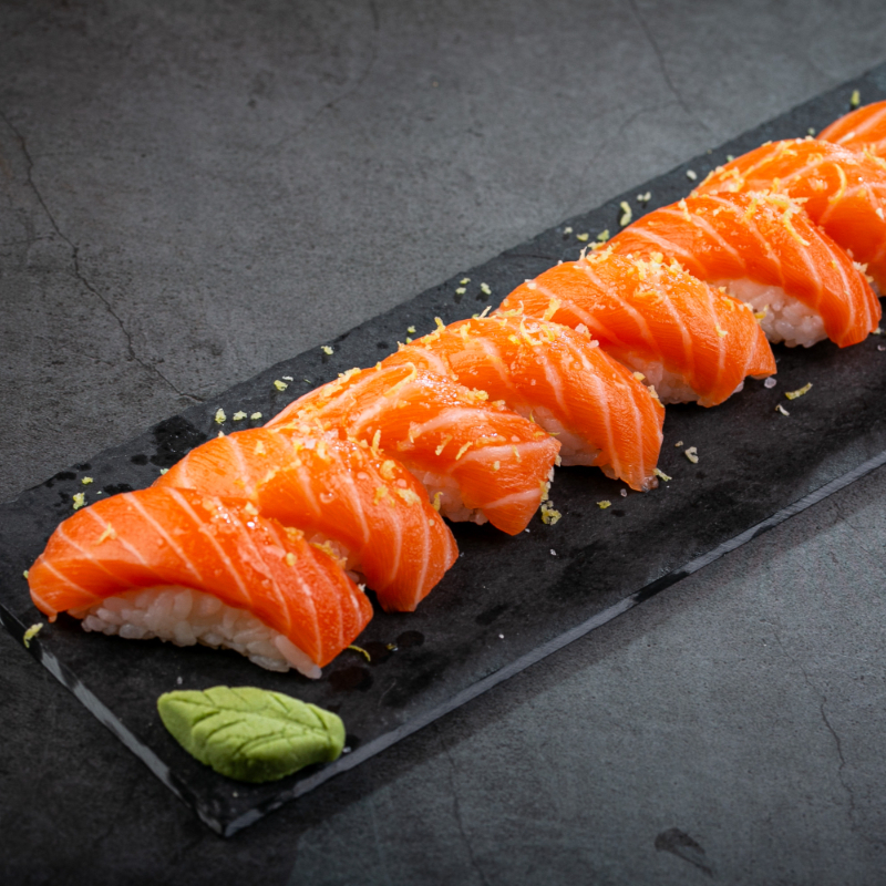 (5 Sashimi de salmão, trufado com limão siciliano 5 nigiri de salmão, trufado com raspas de limão siciliano e flor de sal. Sem alterações!!!)