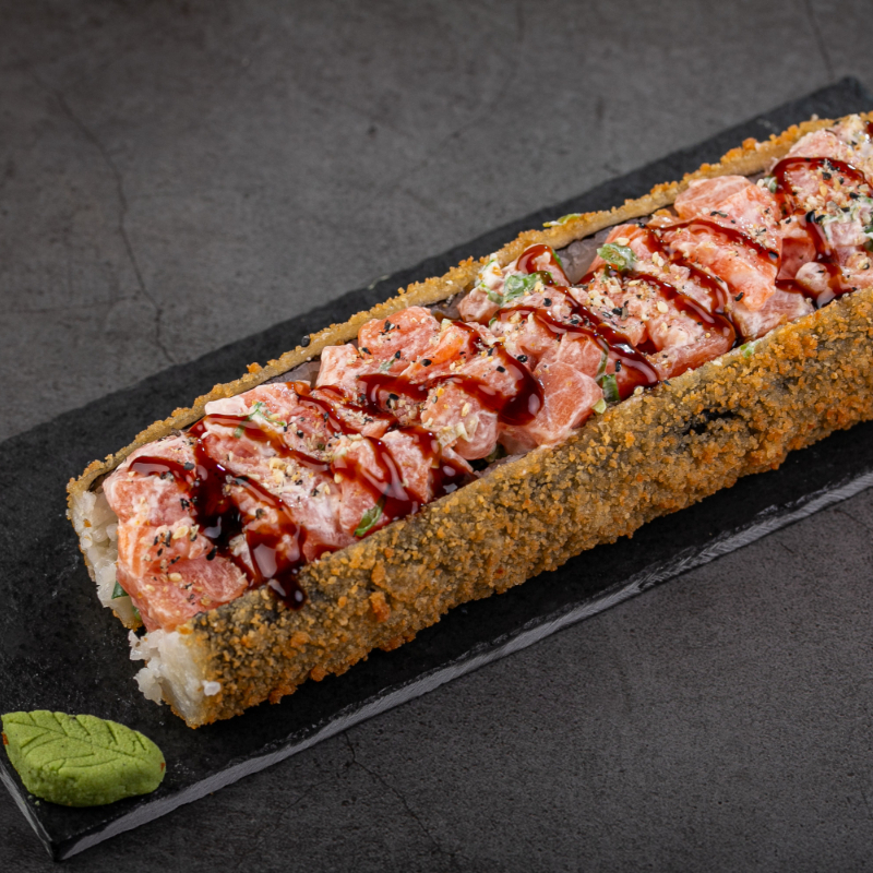 Enrolado empanado recheio de salmão grelhado,cream cheese,tarê e gergelim