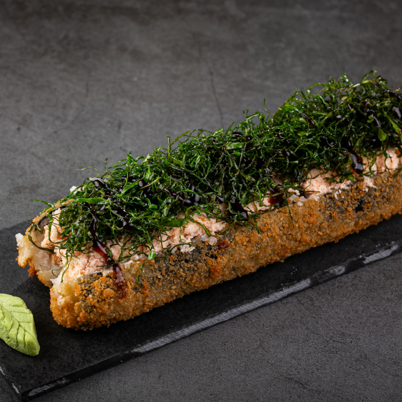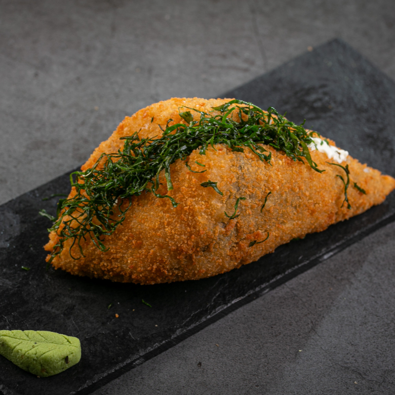 Enrolado empanado com recheio de salmão,cream cheese,cebolinha,tarê e gergelim
