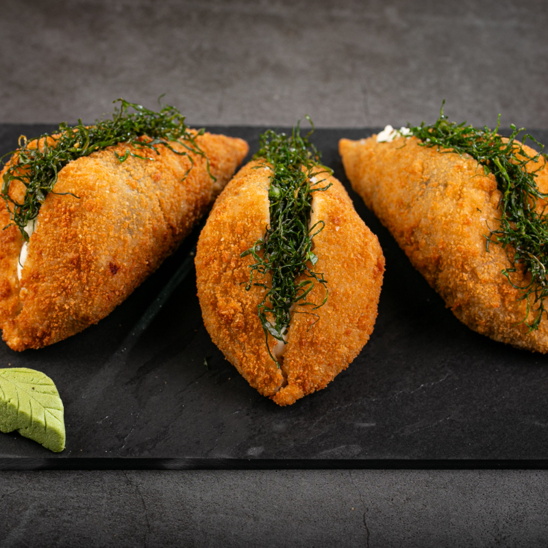 Enrolado empanado com recheio de salmão grelhado couve molho tarê e gergelim