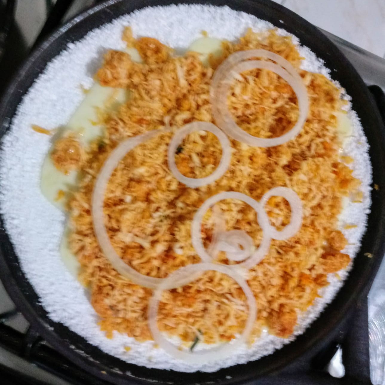 Frango desfiado,temperado, queijo,cebola
