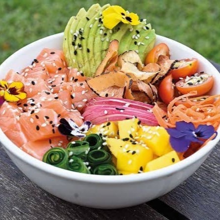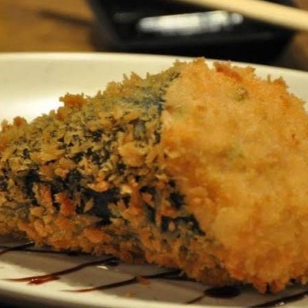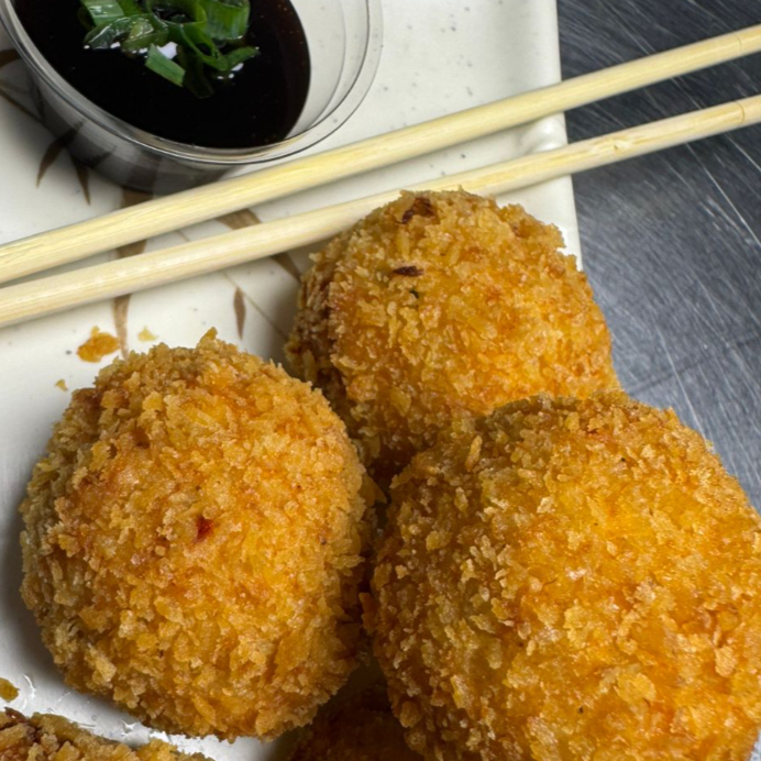 Bolinho cremoso de salmão com um leve toque de pimenta.